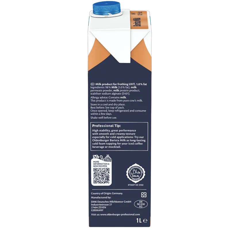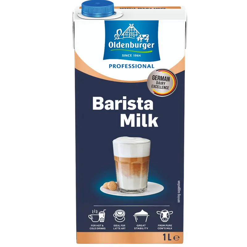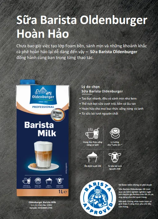 Sữa Barista Oldenburger được phát triển chuyên biệt cho nhu cầu pha chế chuyên nghiệp: kết cấu mượt mà, foam bền, mịn phù hợp cho cả đồ uống nóng lẫn lạnh. Từ “Latte art” chuyên nghiệp đến “Signature drinks” mang dấu ấn riêng, sản phẩm mang lại sự linh hoạt và tin cậy – giúp nâng tầm hương vị và giá trị cho từng món trong thực đơn của bạn.